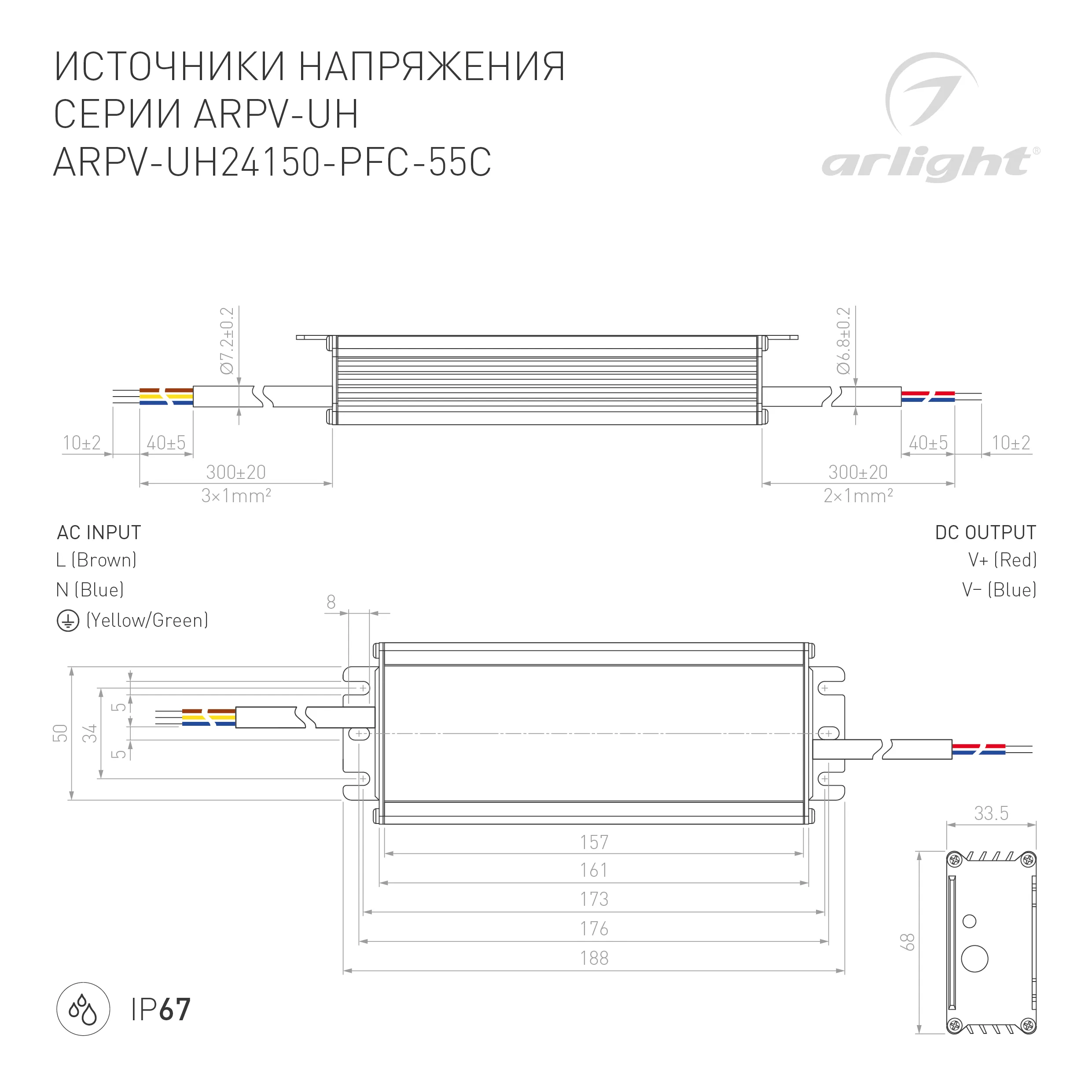 В магазине Мельковский Свет Вы можете купить "Блок питания ARPV-UH24150-PFC-55C (24V, 6.3A, 150W) (Arlight, IP67 Металл, 5 лет)"