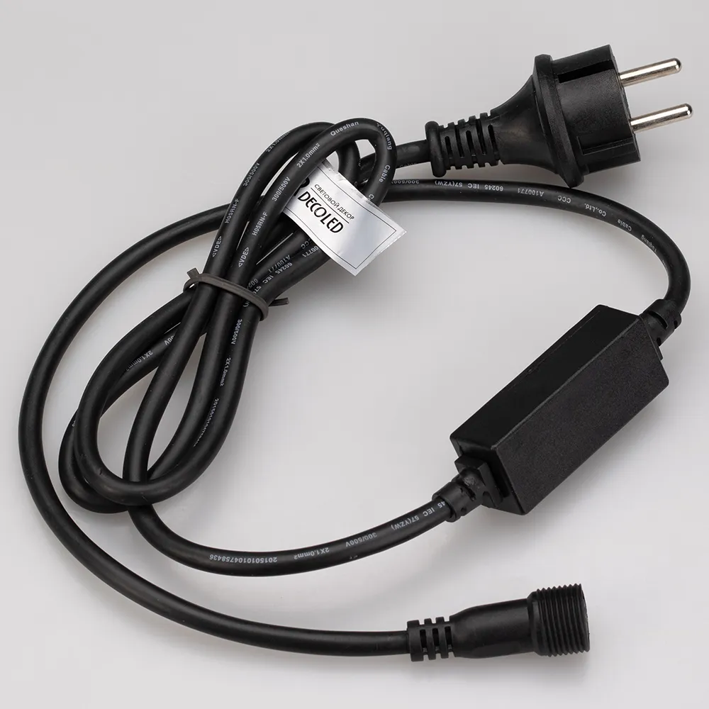 Шнур питания для светодиодных гирлянд постоянного свечения. Материал оболочки ПВХ. Цвет провода чёрный. В комплект входит: шнур питания с вилкой европейского стандарта (IP44), 2pin разъём подключения к гирлянде, выпрямитель AC/DC (1.6A). Длина провода 1.5 метра.