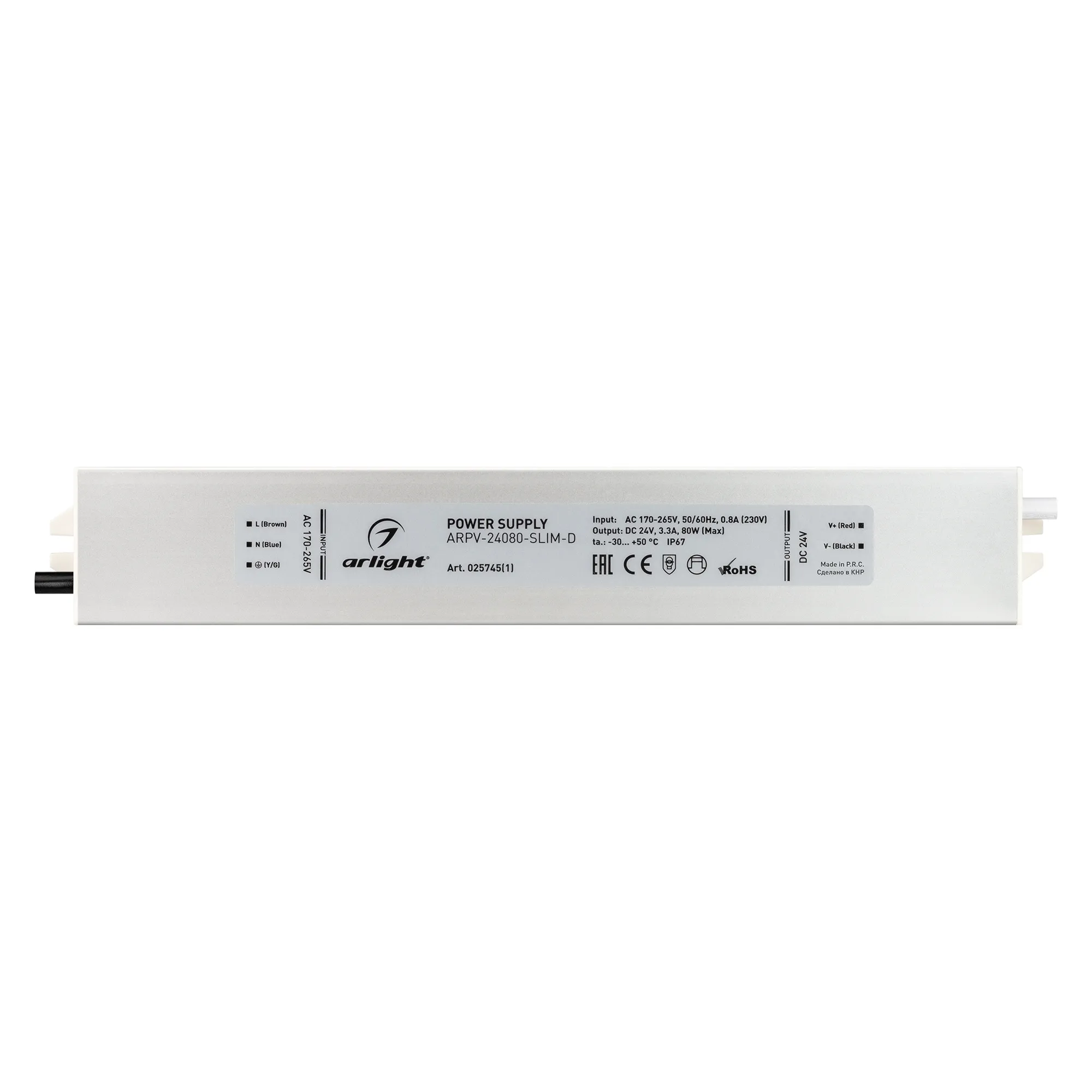 Источник напряжения с гальванической развязкой для светодиодных изделий. Входное напряжение 170-265 VAC. Выходные параметры: 24 В, 3,3 А, 80 Вт. Встроенный PFC >0,5. Герметичный алюминиевый корпус IP 67. Рабочая температура -30…+50C⁰. Габаритные размеры длина 258 мм, ширина 40 мм, высота 22 мм. Гарантийный срок 3 года.