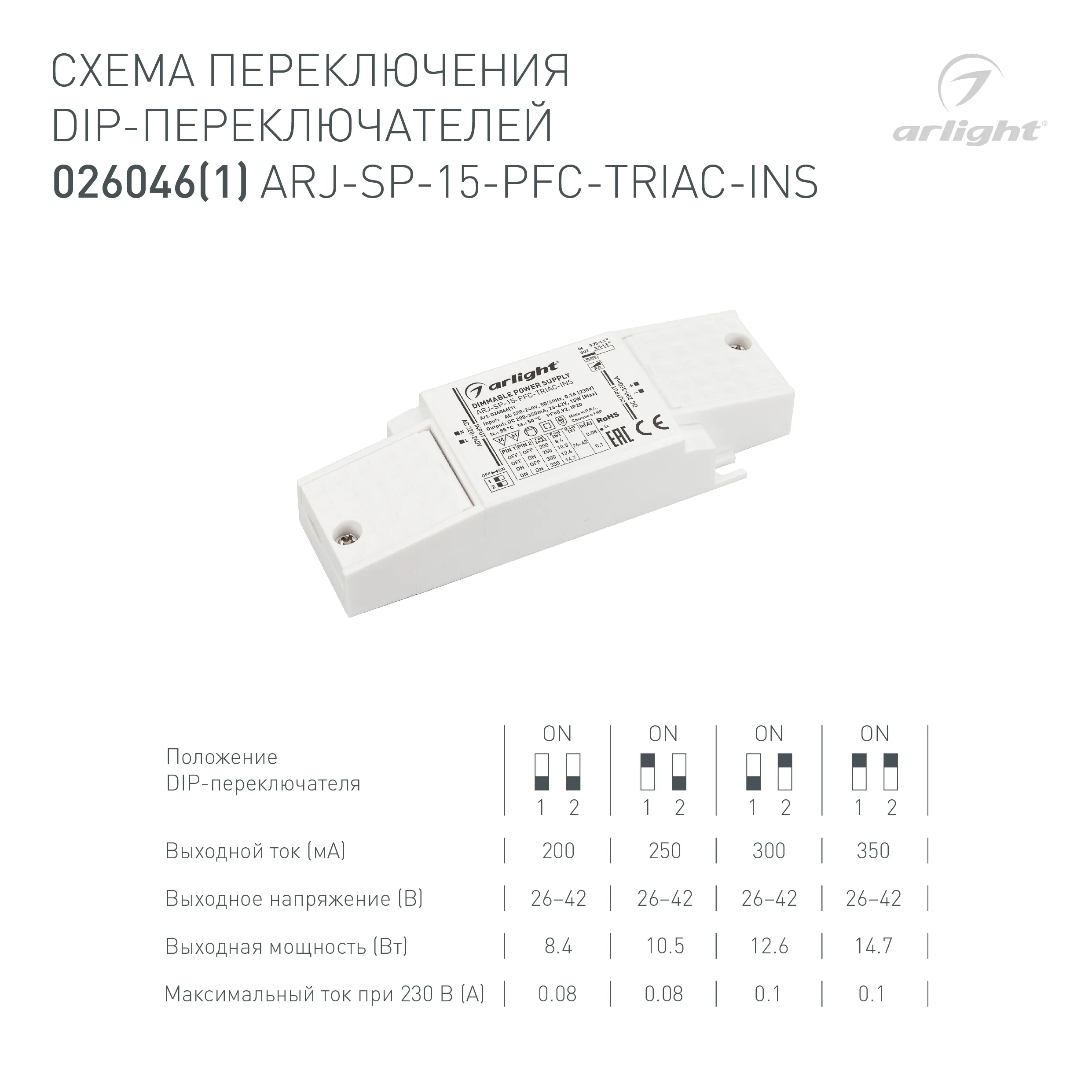 Блок питания ARJ-SP-15-PFC-TRIAC-INS (15W, 26-42V, 0.2-0.35A) (Arlight, IP20 Пластик, 5 лет)