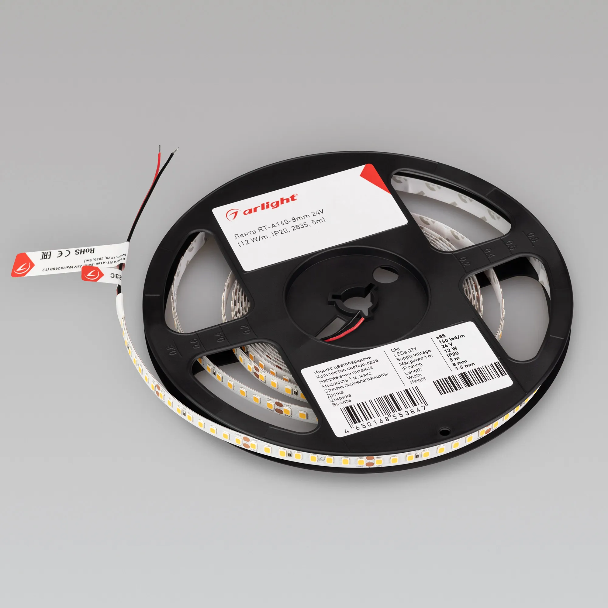 Светодиодная высокоэффективная лента RT серии A160. Светодиоды SMD 2835, 160 шт/м, белая плата шириной 8 мм, скотч 3M. Цвет ТЕПЛЫЙ 2400K, высокая световая эффективность 150 лм/Вт, индекс цветопередачи CRI>85, угол 120°. Питание 24 В, мощность 12 Вт/м (60 Вт на 5 м). Размеры 5000x8x1.5 мм. Мин. отрезок 50 мм, 8 светодиодов. Цена за 1 м.