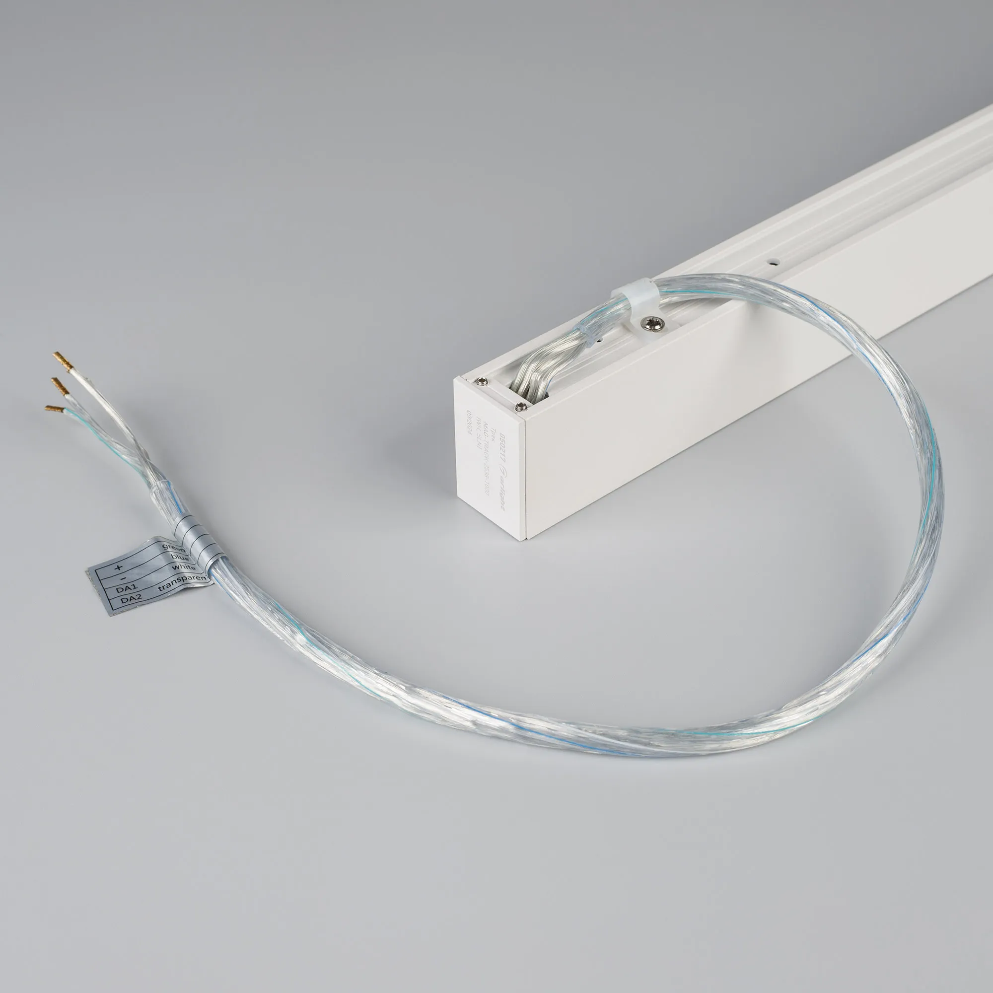 Подвесной, накладной магнитный трек, длина 2000 мм. DC24V, позволяет диммировать светильники по протоколу DALI. Материал алюминий, цвет белый. Две заглушки в комплекте. Размер ДxШxВ: 2003x25x38 мм. Размер (с учетом заглушек). Аксессуары для подвесного монтажа в комплект не входят. К плате идет провод 24В длиной 1м.