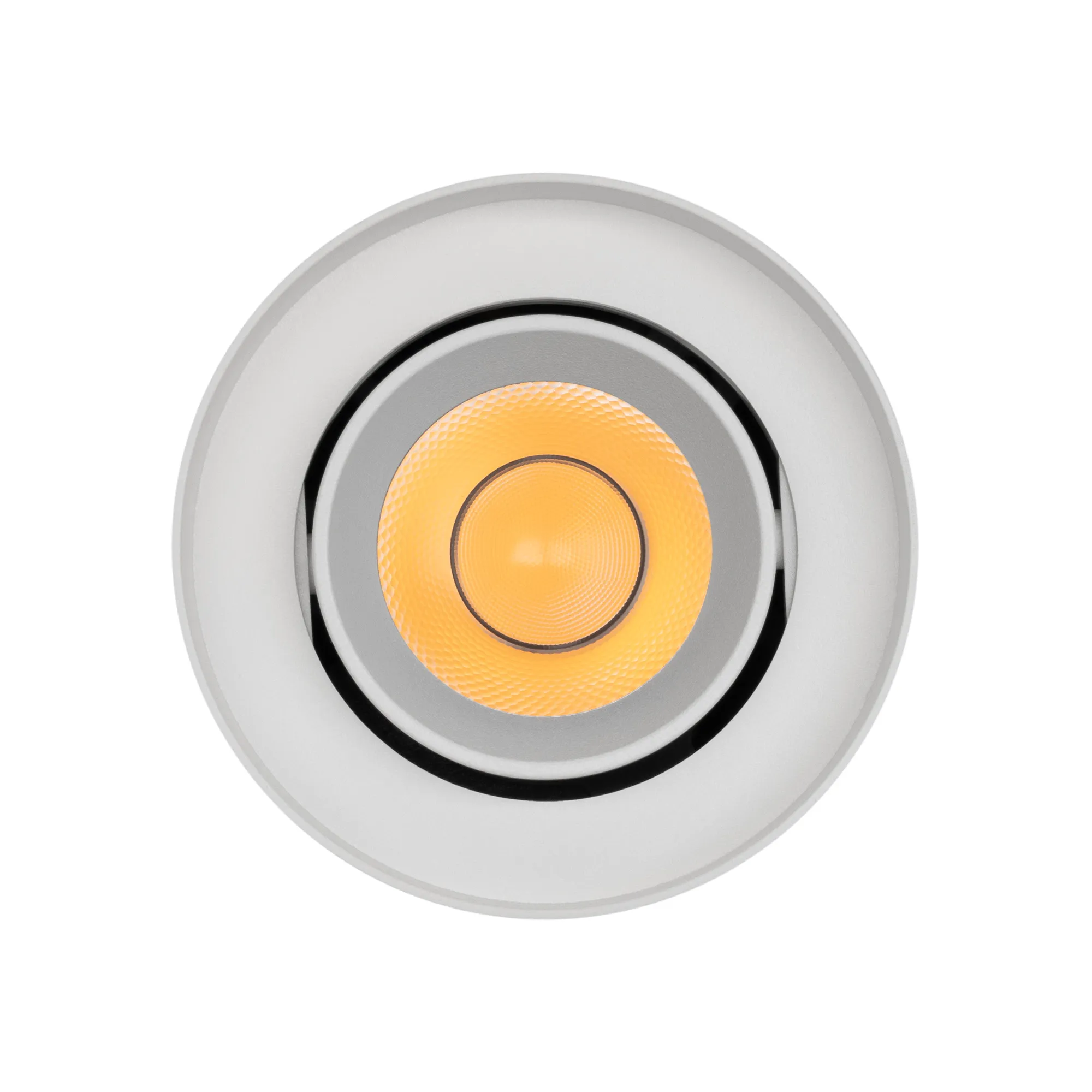 Накладной интерьерный светильник. Мощность 10 Вт, св. поток 970 лм, 93 лм/Вт, дневной 4000 K, CRI>90, угол 15°, регулируемое направление луча 40° (20+20), поворотный световой модуль вокруг своей оси на 340°, UGR <18, напряжение питания 230 В. Белый круглый корпус из алюминия, степень защиты IP54. Размер: диаметр 86,5 мм, высота 120 мм. Монтаж накладной. Драйвер 27-43 В, 250 мА, пульсация <1%.