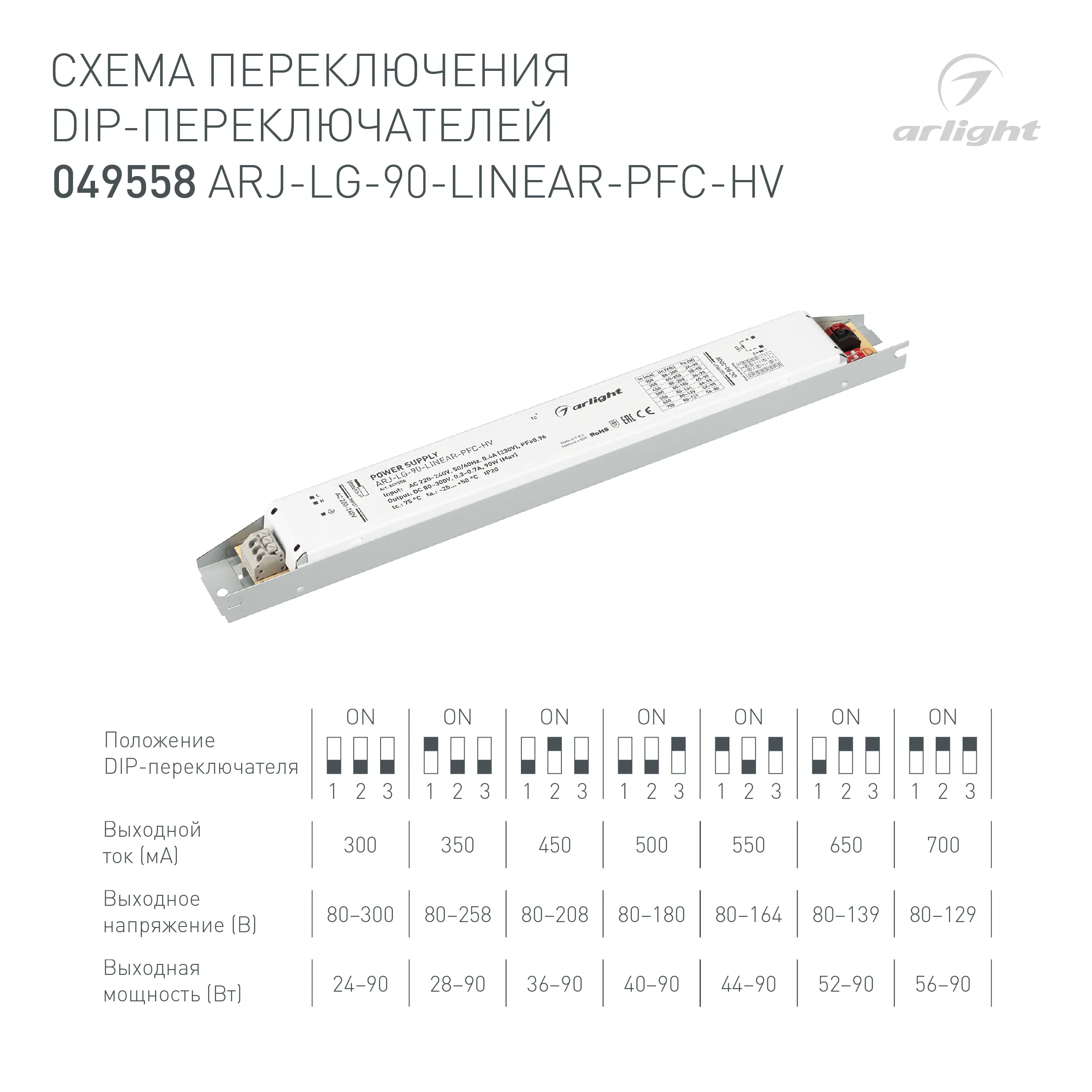 Наши специалисты знают все о продукции Arlight и с радостью помогут Вам выбрать комплектующие к товару "Блок питания ARJ-LG-90-LINEAR-PFC-HV (90W, 80-300V, 0.3-0.7A) (Arlight, IP20 Металл, 5 лет)", или другие товары из раздела "регулировка DIP-переключателем".