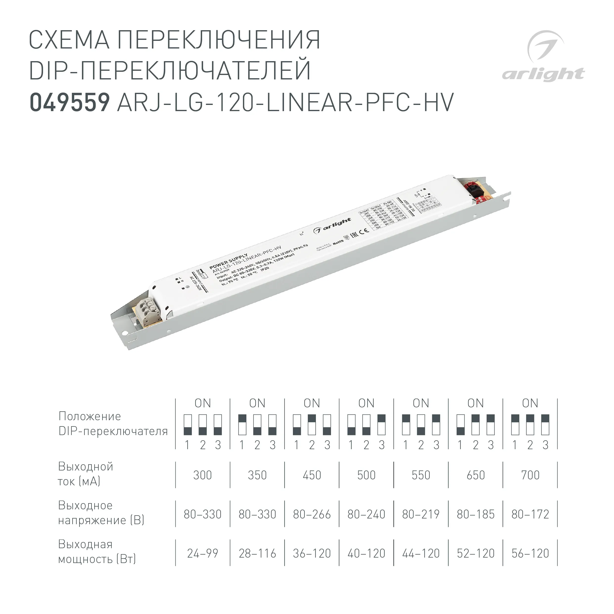 Наши специалисты знают все о продукции Arlight и с радостью помогут Вам выбрать комплектующие к товару "Блок питания ARJ-LG-120-LINEAR-PFC-HV (120W, 80-330V, 0.3-0.7A) (Arlight, IP20 Металл, 5 лет)", или другие товары из раздела "регулировка DIP-переключателем".