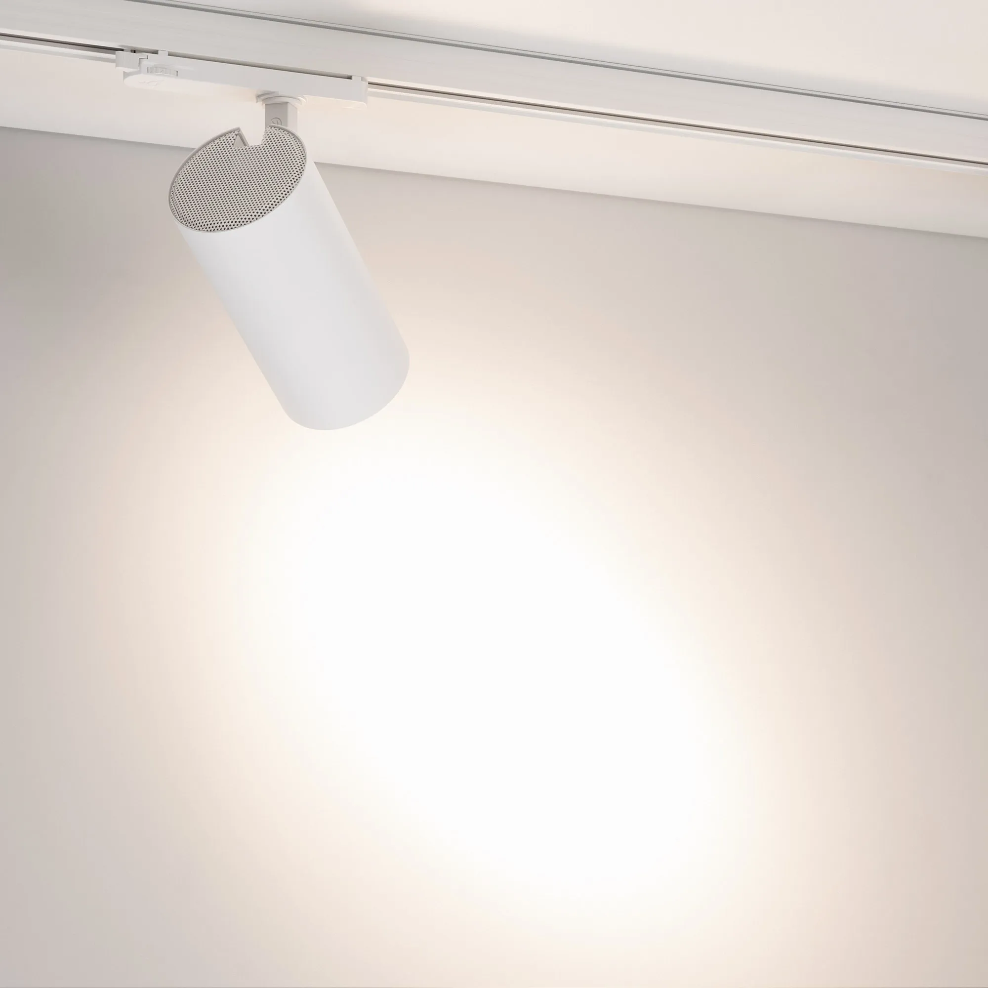Светильник для треков/шин 4 провода. Мощность 30 Вт, св. поток без решетки honeycomb 3000 лм, 100 лм/Вт, с решеткой honeycomb 1980 лм, 66 лм/Вт, дневной 4000 K, CRI>90, угол 15°, напряжение питания 230 В. Белый круглый корпус из алюминия, материал линзы PMMA, степень защиты IP20. Размер: диаметр 90 мм, длина световой части 141 мм. Монтаж на трек 3-фазный. Драйвер встроенный 24-42 В, 750мА., пульсация <5%