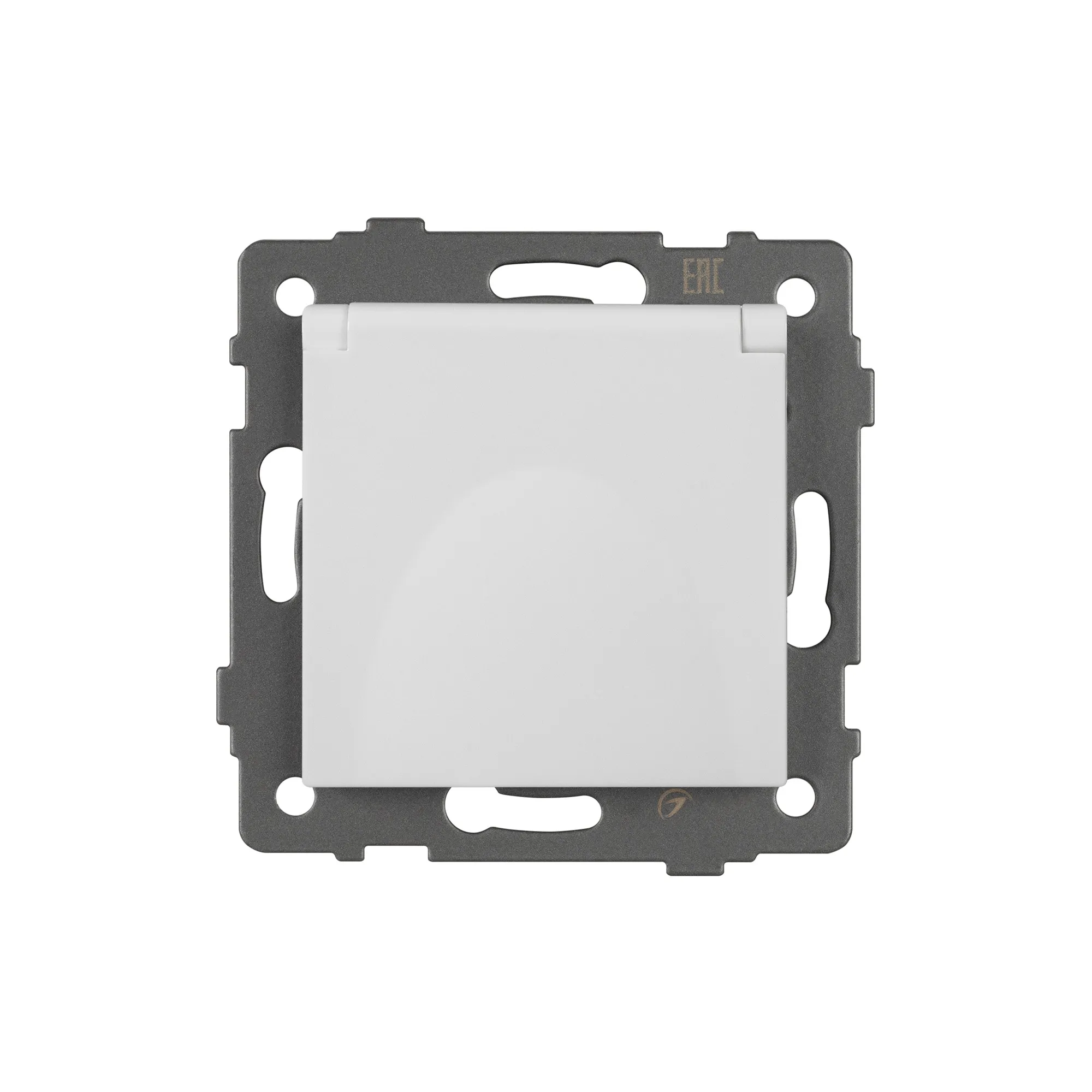 Механизм розетки с заземлением на 1 пост с влагозащитной крышкой. Цвет - белый. Без фронтальной рамки. Уровень пылевлагозащиты IP44. Устанавливается в стандартный подрозетник.