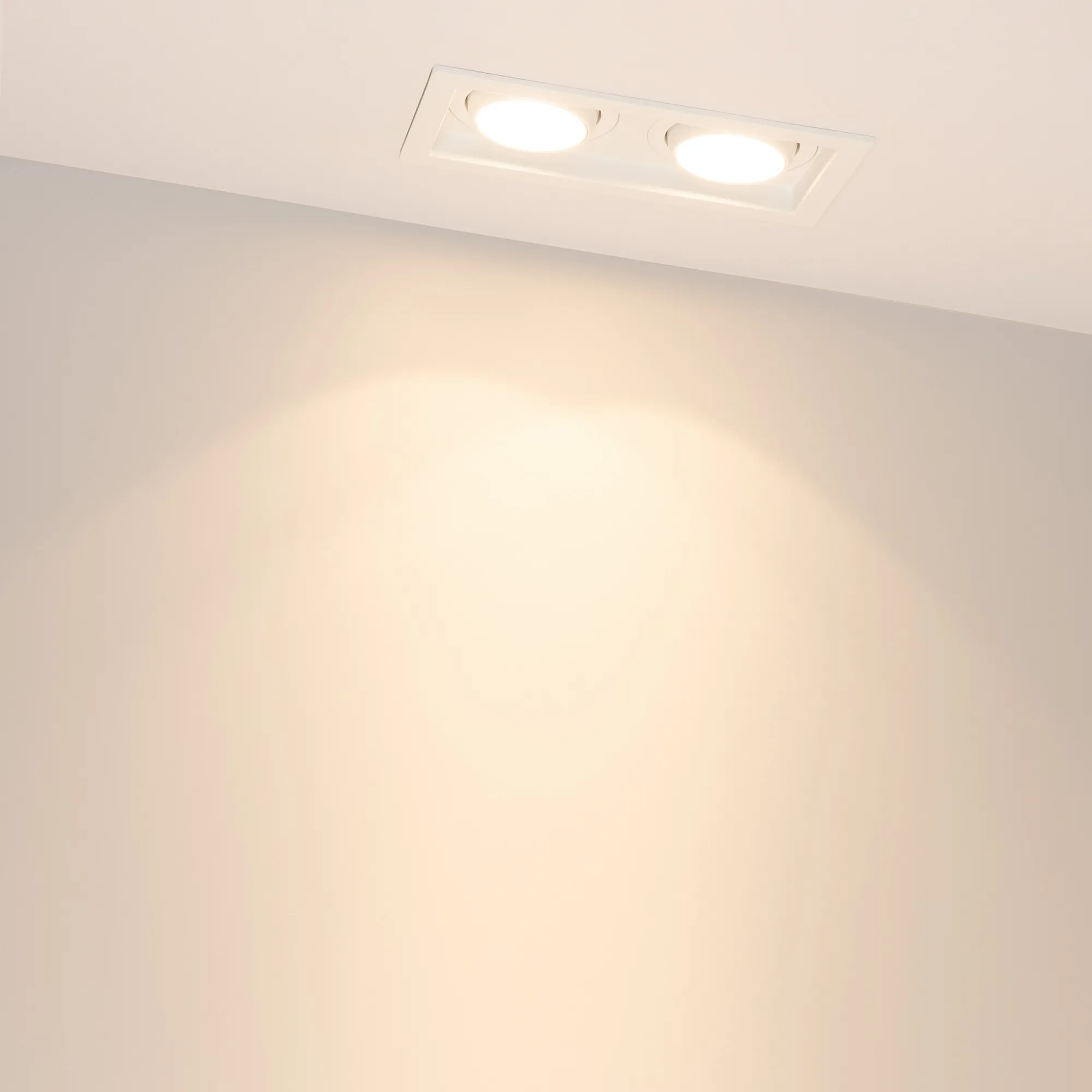Встраиваемый карданный светильник. Мощность 2х12 Вт, св. поток 2636 лм, 109 лм/Вт, тёплый 3000 K, CRI>92, угол 20°, напряжение питания 230 В. Белый корпус из алюминия, белая вставка, степень защиты IP20. Размер: длина 170 мм, ширина 90 мм, высота 80 мм. Монтаж встраиваемый, установочное отверстие: длина 155 мм, ширина 75 мм. Драйвер 27-40 В, 300 мА, пульсация <2%.
