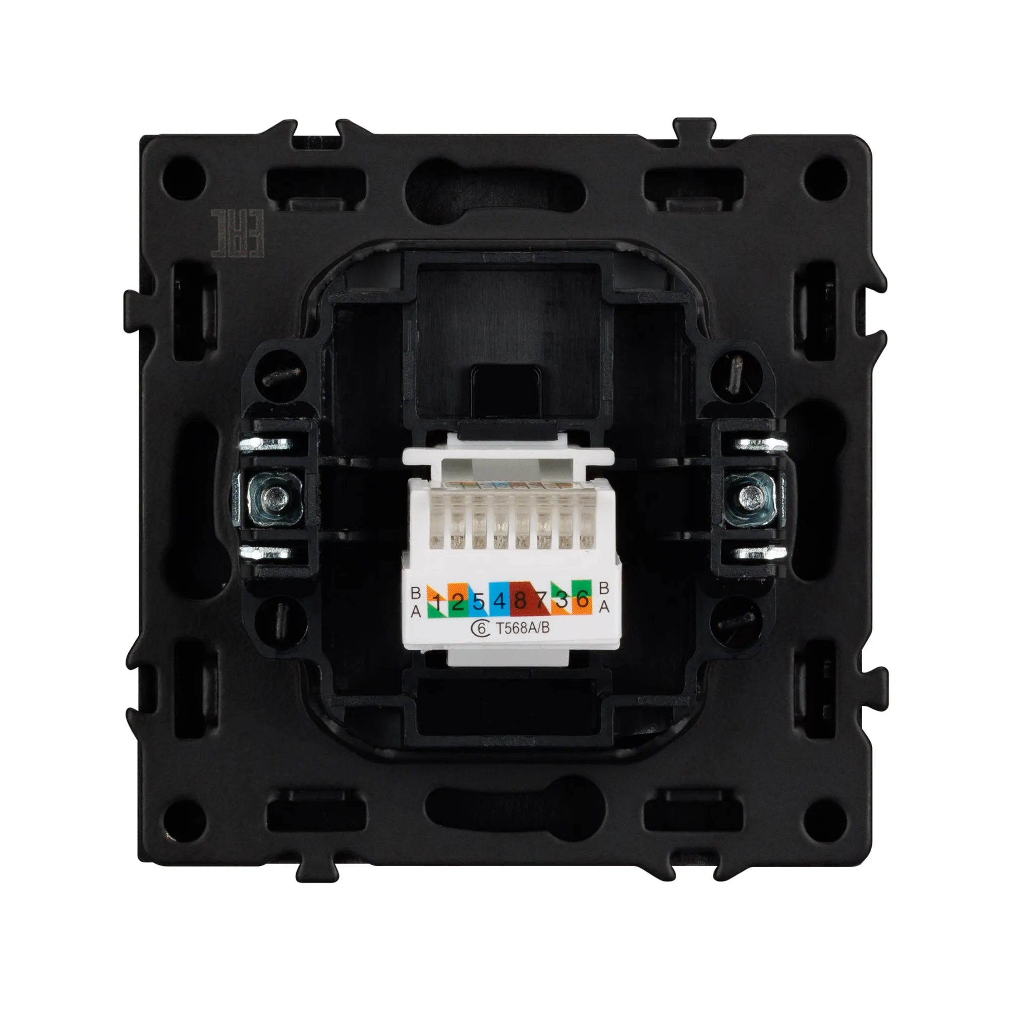 Механизм компьютерной розетки на 1 пост 6-й категории. Цвет - серый, с Soft-Touch покрытием. Без фронтальной рамки. Уровень пылевлагозащиты IP20. Тип подключаемого разъема - RJ45. Розетка устанавливается в стандартный подрозетник круглого сечения диаметром 60мм.