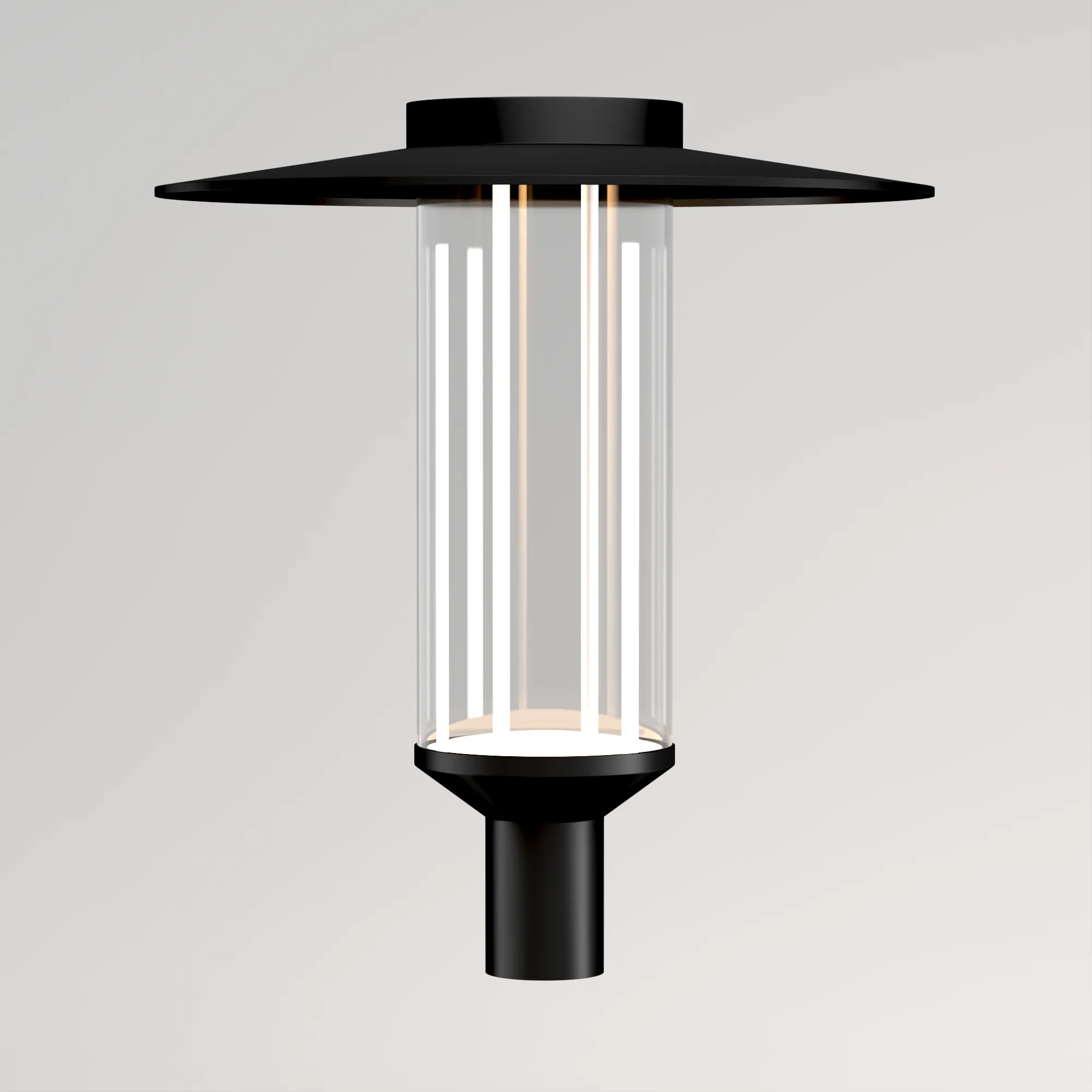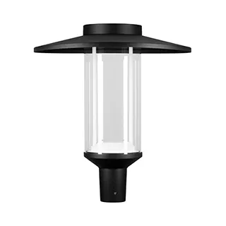 Венчающий светодиодный светильник. Мощность 50 Вт, св. поток 5700 лм, 115 лм/Вт, тёплый 3000 K, CRI>80, угол 130°, напряжение питания 230 В. Черный корпус из алюминия, экран закаленное стекло, степень защиты IP65. Размер: диаметр 550 мм, высота 640 мм. Монтаж на вертикальную опору диаметром 76 мм.