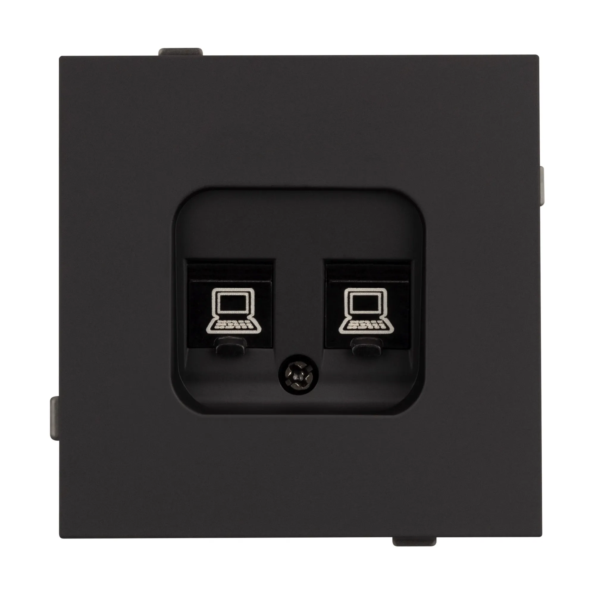 Механизм компьютерной розетки на 2 поста 6-й категории. Цвет - черный, с Soft-Touch покрытием. Без фронтальной рамки. Уровень пылевлагозащиты IP20. Розетка устанавливается в стандартный подрозетник круглого сечения диаметром 60мм.