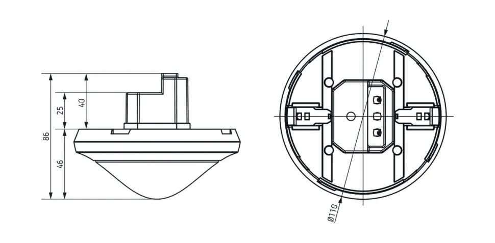 - Круглая зона обнаружения 360 °, Ø 24 м (452 м 2 ) при высоте установки 3 м